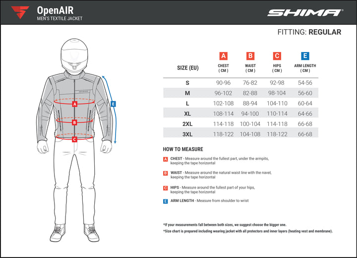 Shima OpenAir zawiera ochronę zabezpieczenia barku i łokcia na poziomie standardowym, który odpowiada wymaganiom UE i ochronie pleców CE poziom 2. Ochrony są zaprojektowane w specjalnej podwójnej warstwie plaster miodu. Zapewniają niezawodną ochronę i oddychają. W zderzeniu zabezpieczenia leczą i pochłaniają maksymalną moc uderzenia.