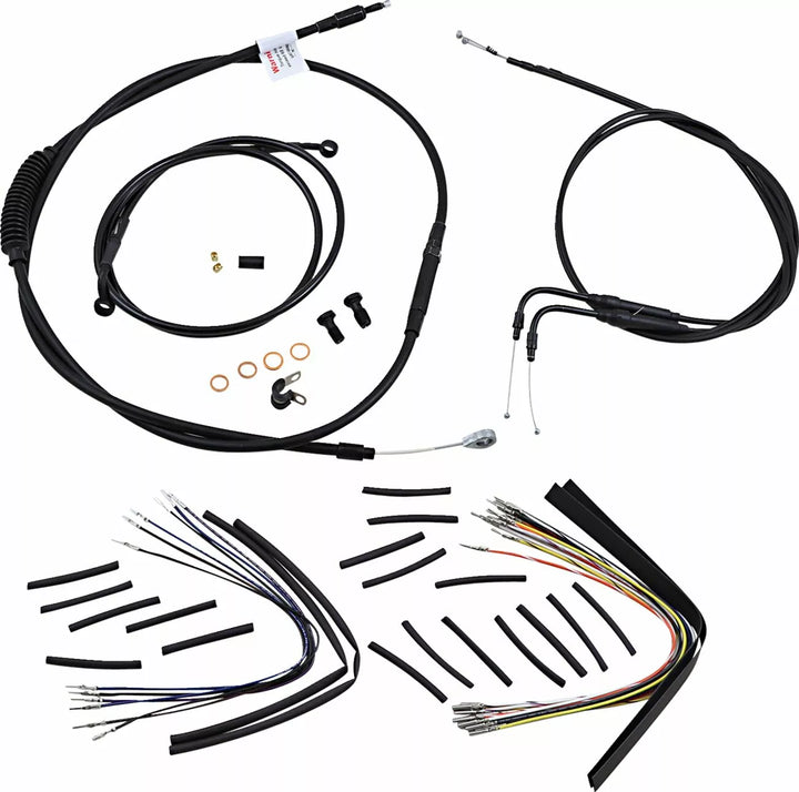 Kompletny zestaw instalacyjny dla krzepkowych wieszaków małpy, zestaw zawiera rozszerzoną linię hamulcową (o ile nie zaznaczono), rozszerzoną linię kabla/sprzęgła, przedłużone kable przepustnicy/bezczynności w razie potrzeby i wszystkie wymagane okablowanie, kit, kit oparty na użyciu 2 „Rise, w tym, felemudd, zewnętrzne warkocze.