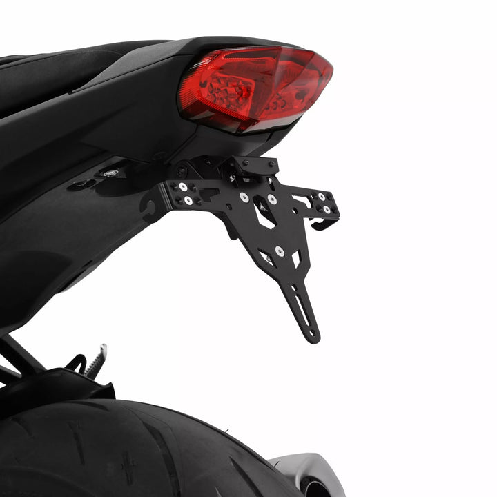 Uchwyt tablicy rejestracyjnej jest wyjątkowo trwałym i odpornym na pogodę., Czarny proszek powleczony. , Uchwyt rejestracyjny może być używany do dowolnego rodzaju tablicy rejestracyjnej (szerokość 175 mm)., Nie wymaga modyfikacji owiewki., Storessowa regulacja kąta rake., Obsługa wskaźnika regulowana w 3 pozycjach. Płyta., Specjalne mocowanie światła wskaźnika (sprzedawane osobno) wymagane dla świateł wskaźników magazynowych., Zestaw obejmuje: 1 uchwyt rejestracyjny w tym. Zestaw montażowy., LED Light Light „E zatwierdzony”. Wsparcie., Wsparcia z wsparciem.