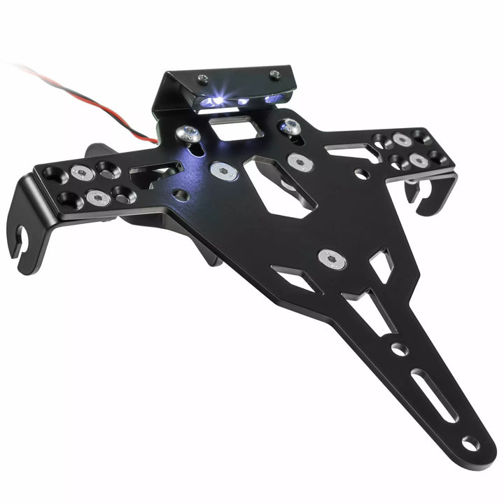 Uchwyt tablicy rejestracyjnej jest wyjątkowo trwałym i odpornym na pogodę., Czarny proszek powleczony. , Uchwyt rejestracyjny może być używany do dowolnego rodzaju tablicy rejestracyjnej (szerokość 175 mm)., Nie wymaga modyfikacji owiewki., Storessowa regulacja kąta rake., Obsługa wskaźnika regulowana w 3 pozycjach. Płyta., Specjalne mocowanie światła wskaźnika (sprzedawane osobno) wymagane dla świateł wskaźników magazynowych., Zestaw obejmuje: 1 uchwyt rejestracyjny w tym. Zestaw montażowy., LED Light Light „E zatwierdzony”. Wsparcie., Wsparcia z wsparciem.