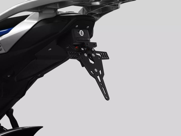 Uchwyt tablicy rejestracyjnej jest wyjątkowo trwałym i odpornym na pogodę., Czarny proszek powleczony. , Uchwyt rejestracyjny może być używany do dowolnego rodzaju tablicy rejestracyjnej (szerokość 175 mm)., Nie wymaga modyfikacji owiewki., Storessowa regulacja kąta rake., Obsługa wskaźnika regulowana w 3 pozycjach. Płyta., Specjalne mocowanie światła wskaźnika (sprzedawane osobno) wymagane dla świateł wskaźników magazynowych., Zestaw obejmuje: 1 uchwyt rejestracyjny w tym. Zestaw montażowy., LED Light Light „E zatwierdzony”. Wsparcie., Wsparcia z wsparciem.